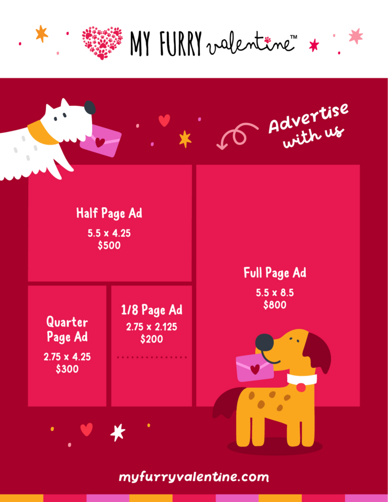 Ads should be 300dpi and final design submitted to advertise@myfurryvalentine.com by January 3rd, 2026. Ad space is limited. If for any reason your ad cannot be included you will be refunded in full.