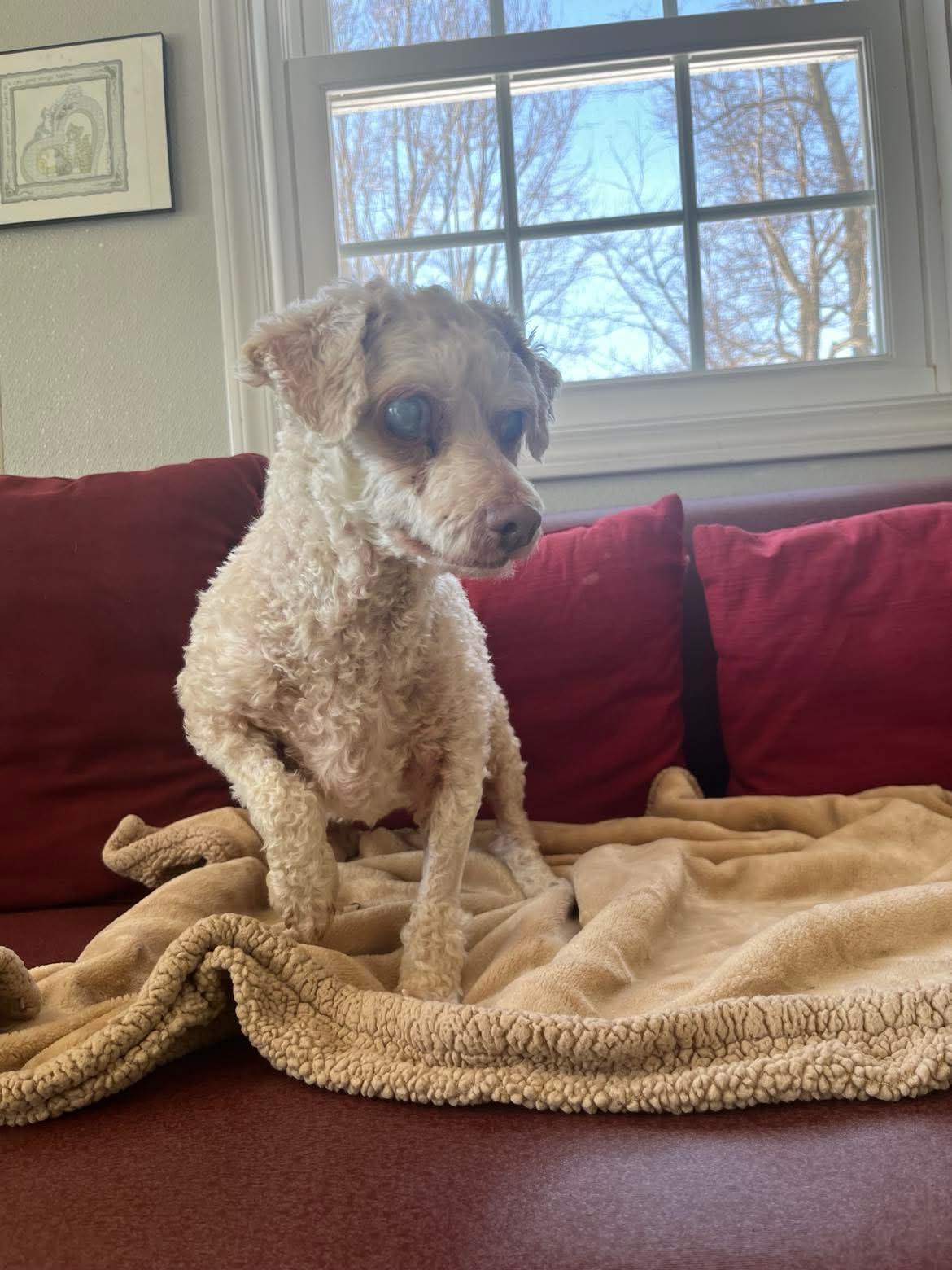 Bitsy is a 10 year old female maltese and poodle mix who is blind. She still has energy though and likes playing with toys, and craves human interaction.