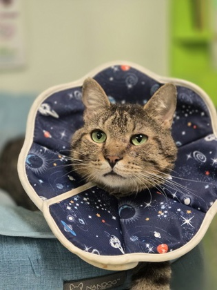 What a name! Maybe that’s where they found me? I have had a rough time of it recently and I am currently sporting a rather ridiculous necklace. However, the people here are taking great care of me and I should be in A1 shape again in no time. I am a nice big tabby boy who just celebrated his second birthday. You may find other cats in my room who are more aggressive about asking for your attention, but you won’t find one more deserving or appreciative. Make sure to look under the cage for me. It’s kind of my hangout.