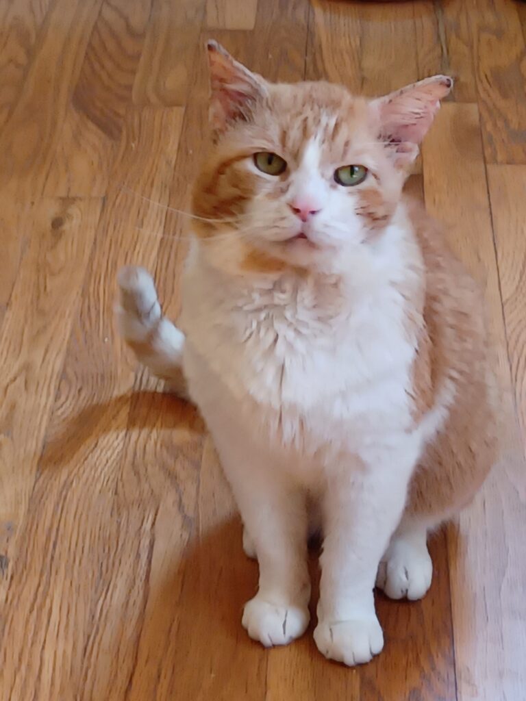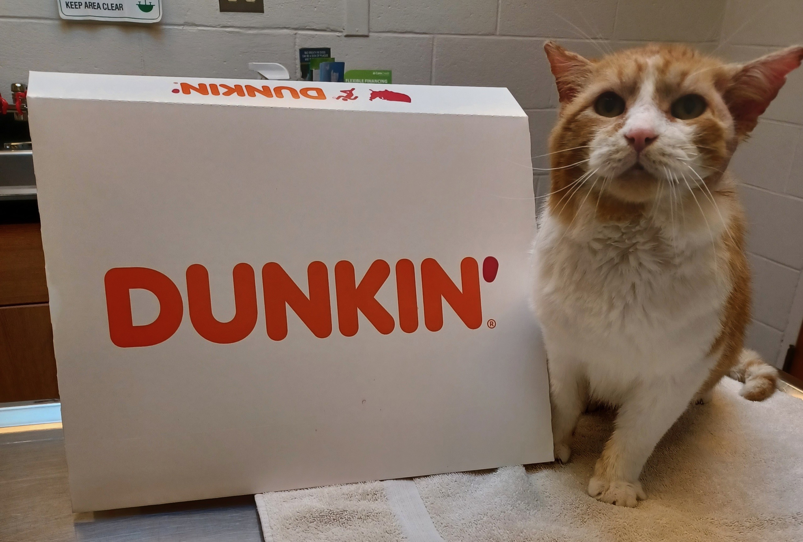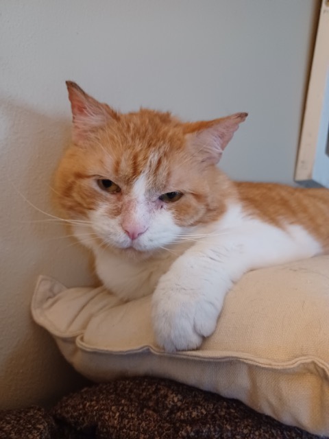 Hi – I’m Dunkin’ and I’m about 7 years old! My foster mom named me Dunkin’ because I’m so sweet, and I’m orange and white like their logo (ok, she might have a caffeine addiction, but she’s pretty cool otherwise). I somehow ended up living outside and I got these awful ear mites, and I scratched my head and ears until they bled. A nice guy found me and took me to the vet where I got all cleaned up and neutered. Then the coffee lady brought me to her house to hang out for a while. Foster mom says I’m loving and easy going, and I only meow when I’m hungry (which is kinda all the time ‘cause I LOVE food). I don’t really understand what toys are for but that’s ok, if I have you then that’s all I need! I guess when I was outside another kitty fought with me and I got a virus called FIV. The vet says I seem healthy and not to let it get me down because with good nutrition and regular checkups, I will have a great life with someone. I sure hope it’s you! Although I love foster mom, I can’t wait to have a purrmanent home of my own. I haven’t met any other cats or dogs recently, but the man who found me said I ignored other kitties. So if you have some and they don’t mind me, I think we’ll all get along great! Adoption app: https://www.purrfectadditionsinc.com/adopt