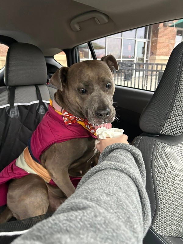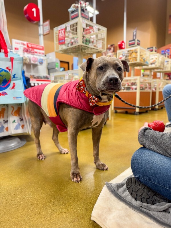 Lizzy is the total package! Good with other dogs, cat-approved, and loves kids. She walks beautifully on leash, is mostly crate trained, and never destructive when left alone while in her foster home. Plus, she’s super food-motivated and eager to please, making training a breeze. She’s also a world-class snuggler with a big, funny personality. Lizzy loves to zoom around the yard with her dog friends, then curl up on the couch to share her signature side-eye and goofy faces that keep everyone smiling.