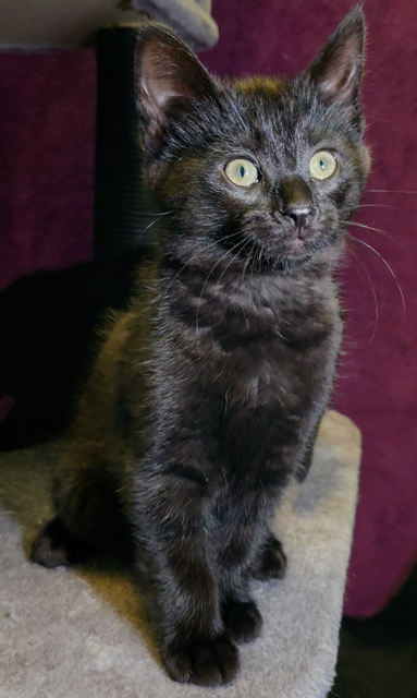 Nyx has a calm sweetness to her but still enjoys a good chase or climb. She likes to watch what everyone else is doing and then join in once she’s sized up the situation. She’s affectionate, responsive, and surprisingly cuddly when she’s in a cozy mood. She’d thrive in a home that appreciates a kitten with both playful curiosity and a mellow, thoughtful nature. Adoption app: https://www.purrfectadditionsinc.com/adopt