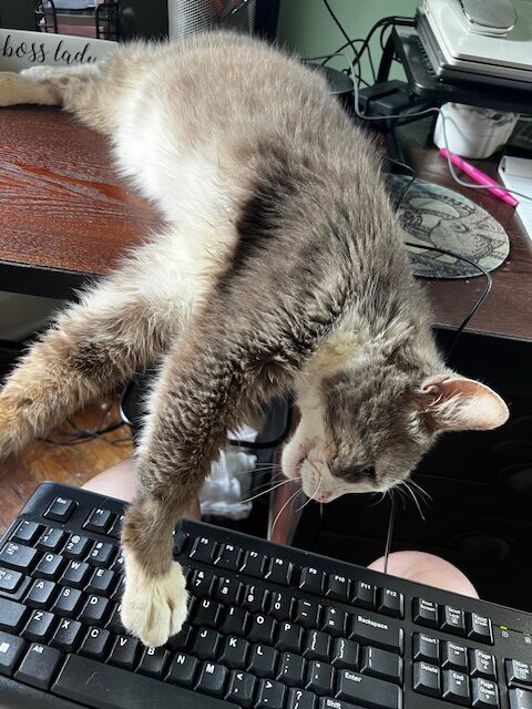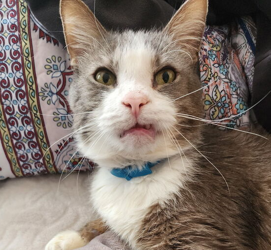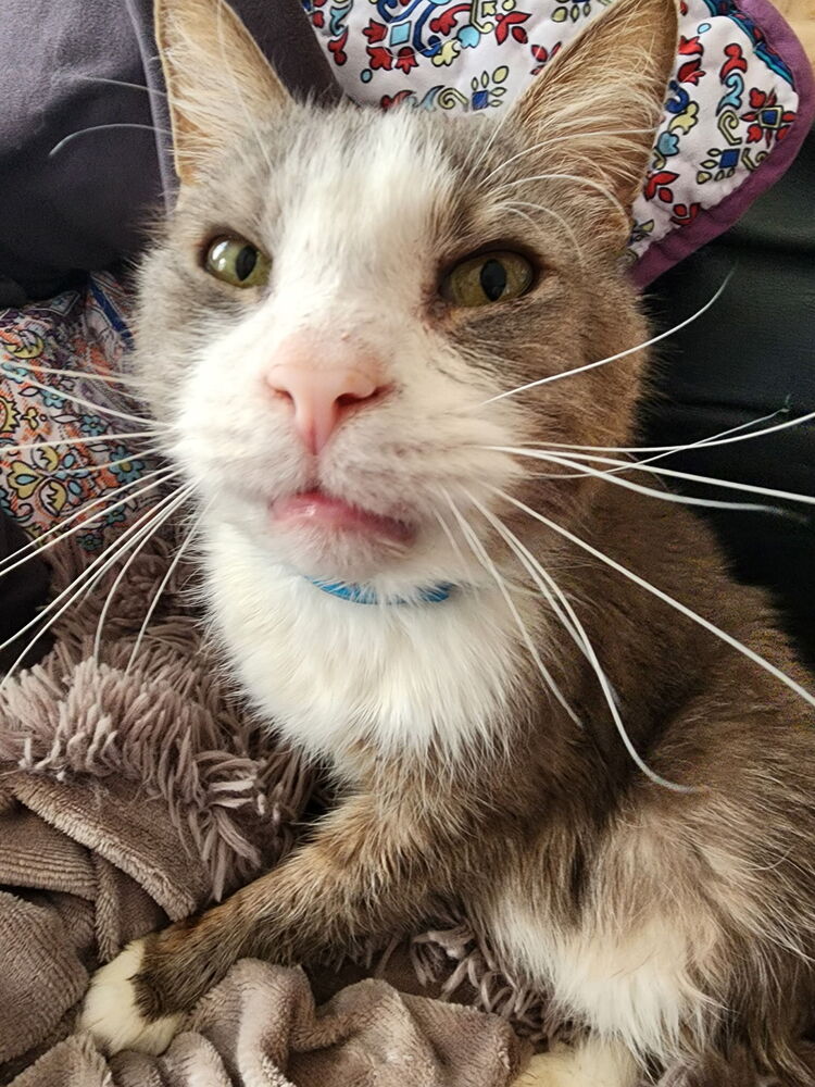 Meet Smokey — The King of Cuddles Smokey may be in hospice care, but he’s living every day with a heart full of love and a purr that could melt the coldest day. This silver-gray sweetheart is the definition of affectionate — he doesn’t just like being close, he insists on it! Smokey’s favorite spot is right on top of you (yes, even your face, if you’ll allow it). He’s known for his “pawsy” nature, gently reaching out with a soft paw to touch your cheek as he gazes into your eyes, as if to say, “I’m here, and I love you.” Due to masses in his mouth, Smokey drools quite a bit — but around here, we call that “liquid love.” His condition doesn’t stop him from enjoying the simple joys: warm laps, cozy blankets, and endless snuggles. Smokey reminds us that every day is a gift, and that love doesn’t have to last forever to be truly meaningful. He’s not just living out his days — he’s making them count, one cuddle at a time. Adoption app: https://www.purrfectadditionsinc.com/adopt